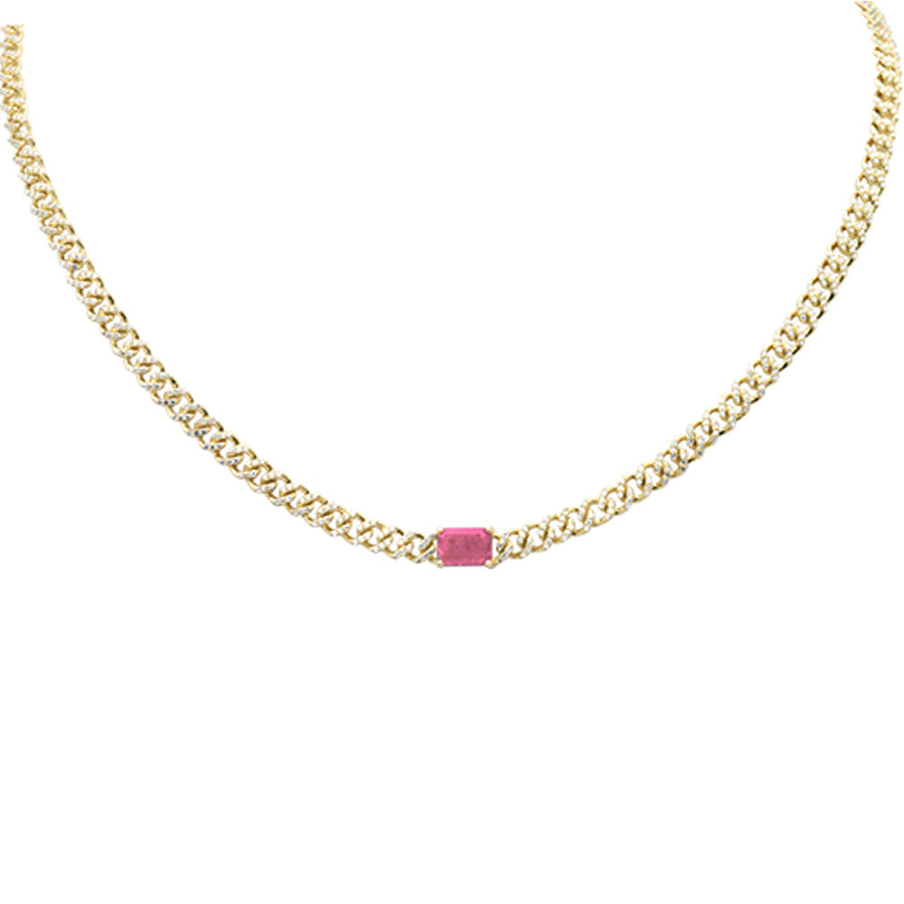 Muse Jewelry 2.45G SI 14K Yellow Gold Diamond & Pink Tourmaline Gemstone Cuban Chain Pendant Necklace 16" Long
